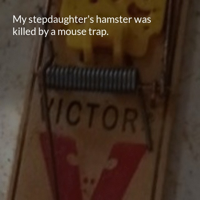 "description": "My stepdaughter's hamster was killed by a mouse trap. My wife was so angry at me that she gave me a slap \n",
