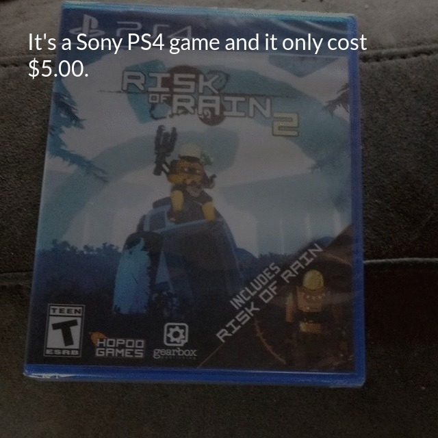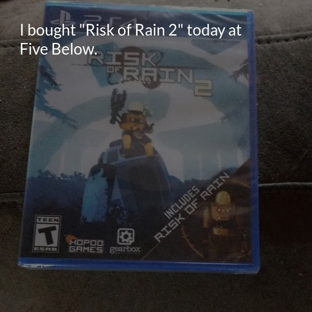 "description": "I bought "Risk of Rain 2" today at Five Below. It's a Sony PS4 game and it only cost $5.00.\n",