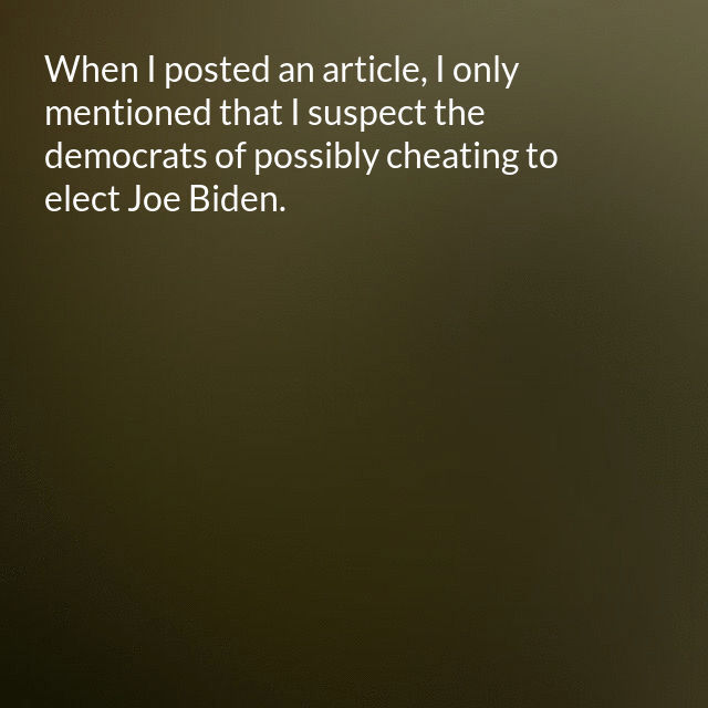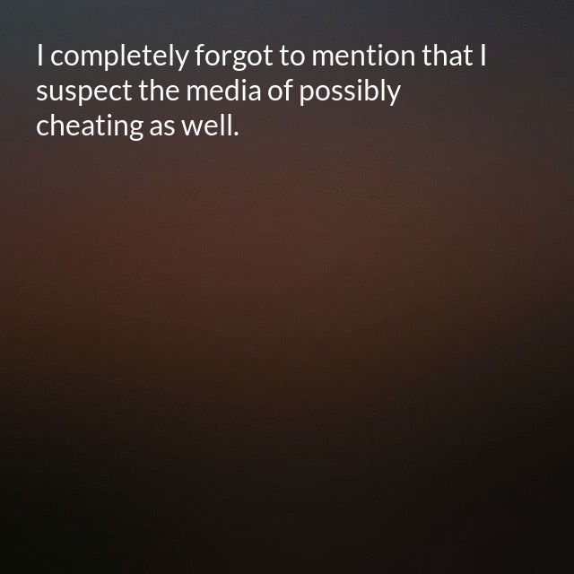 "description": "When I posted an article, I only mentioned that I suspect the democrats of possibly cheating to elect Joe Biden. I completely forgot to mention that I suspect the media of possibly cheating as well.\n",