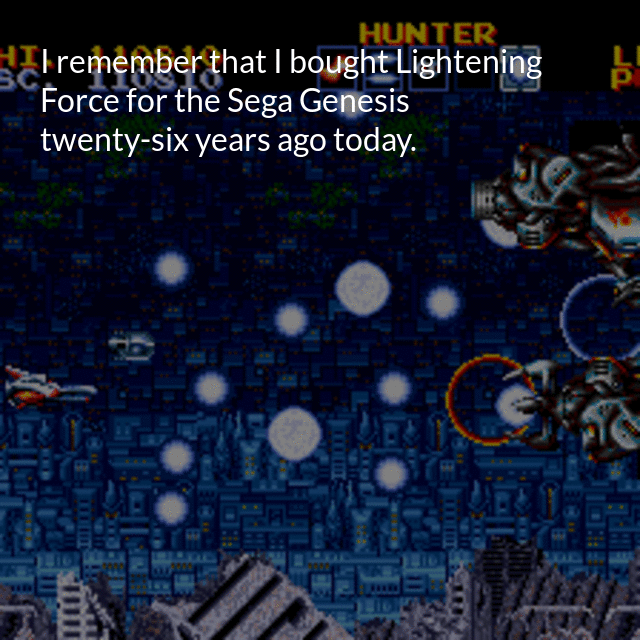 "description": "My memory is usually bad but I do remember some things from the past. I remember that I bought Lightening Force for the Sega Genesis twenty-six years ago today.\n",
