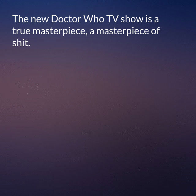 "description": "The new Doctor Who TV show is a true masterpiece, a masterpiece of shit. I have a son who was naughty and needed to be punished so I made him watch it.\n",