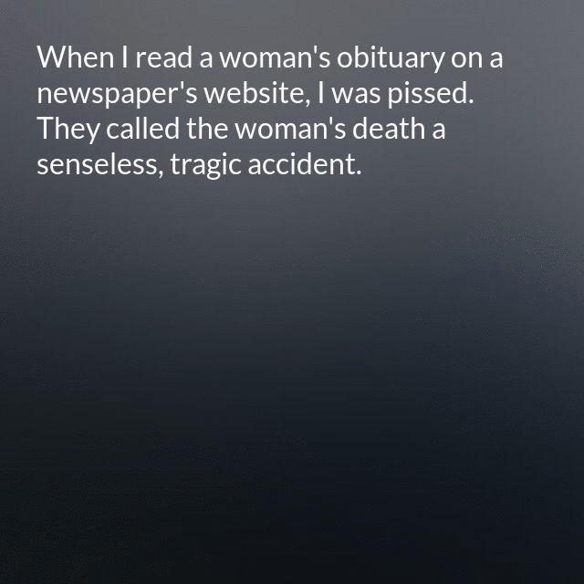 "description": "When I read a woman's obituary on a newspaper's website, I was pissed. They called the woman's death a senseless, tragic accident. That is a load of BULLSHIT!\n",