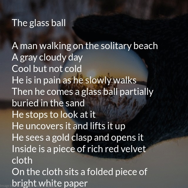 "title": "The glass ball\n\nA man walking on the solitary beach\nA gray cloudy day\nCool but not cold\nHe is in pain as he slowly walks\nThen he comes a glass ball partially buried in the sand\nHe stops to look at it\nHe uncovers it and lifts it up\nHe sees a gold clasp ...",