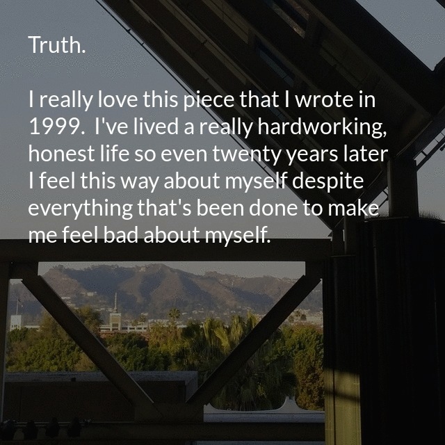 "title": "Truth.\n\nI really love this piece that I wrote in 1999. I’ve lived a really hardworking, honest life so even twenty years later I feel this way about myself despite everything that’s been done to make me feel bad about myself. ",