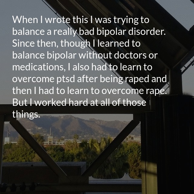 "description": "I really love this piece that I wrote in 1999. I’ve lived a really hardworking, honest life so even twenty years later I feel this way about myself despite everything that’s been done to make me feel bad about myself. When I wrote this I was trying to balance a really bad bipolar disorder. Since then, though I learned to balance bipolar without doctors or medications, I also had to learn to overcome ptsd after being raped and then I had to learn to overcome rape. But I worked hard at all of those things.",