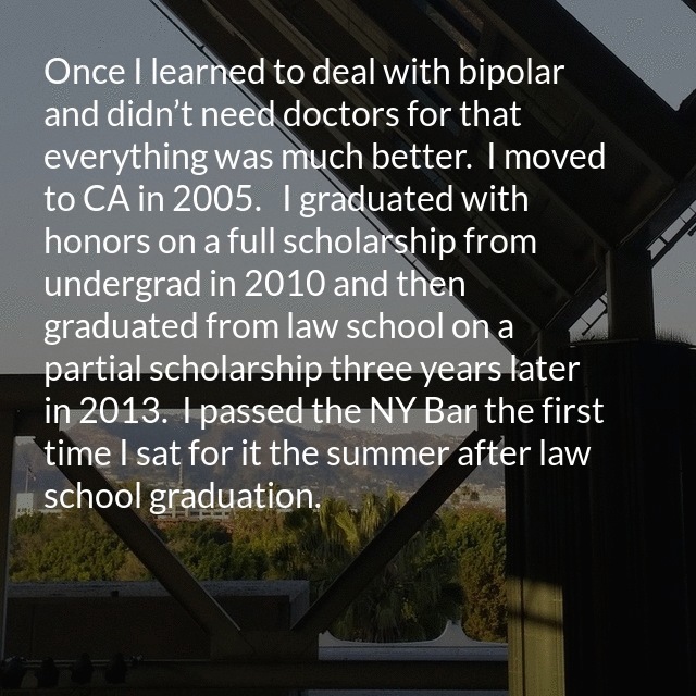 "description": "I used to cut myself but I haven’t in twenty or twenty five years. After I started taking medication for depression, I stopped going to classes and dropped out of high school in 1997. I didn’t get to college full time until 2008. when I was treating my bipolar with diet exercise and living my life in a way that was balanced, I graduated in 2010 from undergrad, got my Juris Doctor in 2013 and passed the ny state bar",