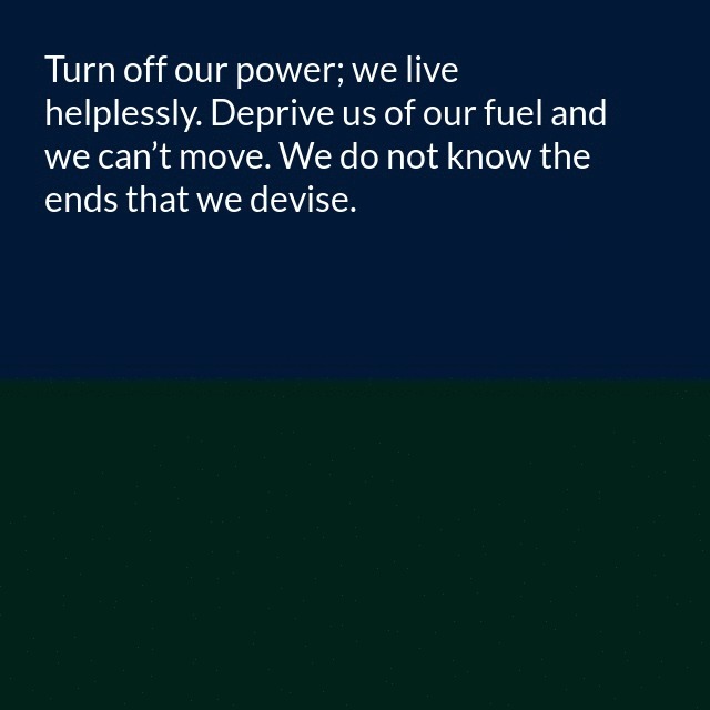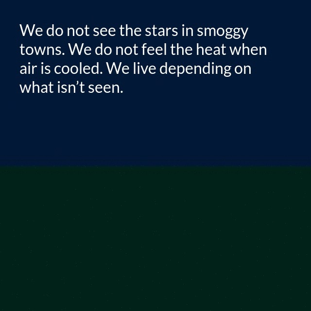 "description": "We do not see the stars in smoggy towns. We do not feel the heat when air is cooled. We live depending on what isn’t seen. Turn off our power; we live helplessly. Deprive us of our fuel and we can’t move. We do not know the ends that we devise.\n",