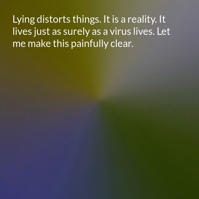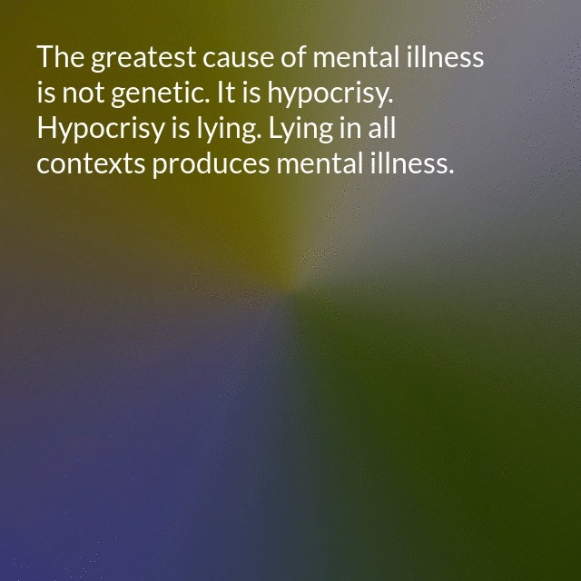 "description": "The greatest cause of mental illness is not genetic. It is hypocrisy. Hypocrisy is lying. Lying in all contexts produces mental illness. Lying distorts things. It is a reality. It lives just as surely as a virus lives. Let me make this painfully clear.\n",