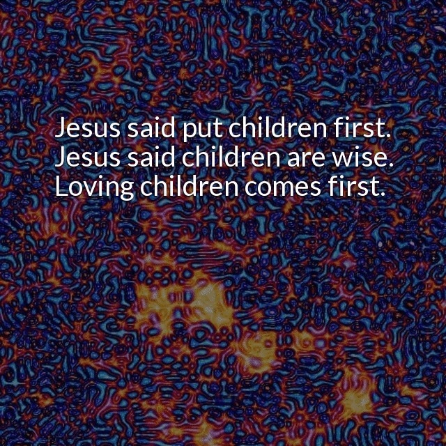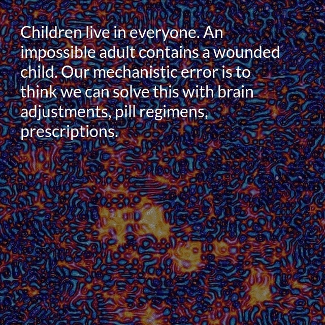 "description": "Jesus said put children first. Jesus said children are wise. Loving children comes first. Children live in everyone. An impossible adult contains a wounded child. Our mechanistic error is to think we can solve this with brain adjustments, pill regimens, prescriptions.\n",