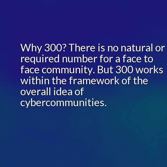 "description": "Why 300? There is no natural or required number for a face to face community. But 300 works within the framework of the overall idea of cybercommunities. It could be smaller but probably not much larger.\n",