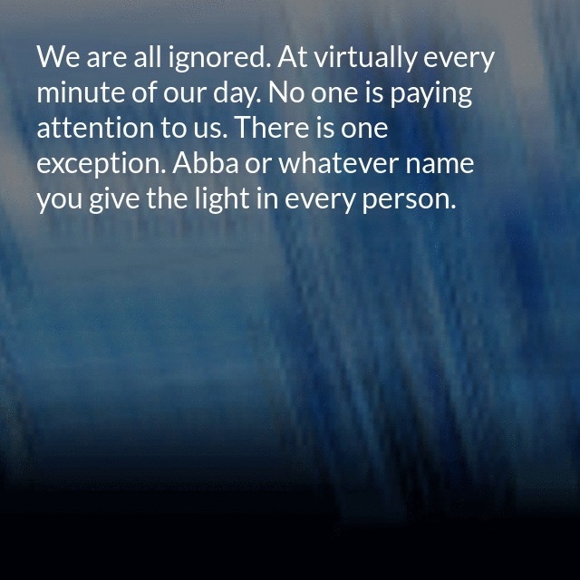 "description": "We are all ignored. At virtually every minute of our day. No one is paying attention to us. There is one exception. Abba or whatever name you give the light in every person. We do not ignore ourselves, we look within.\n",