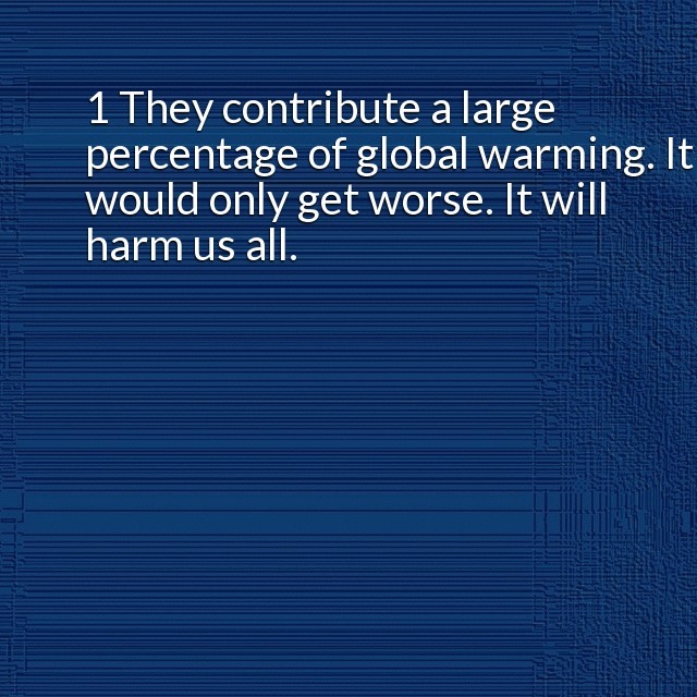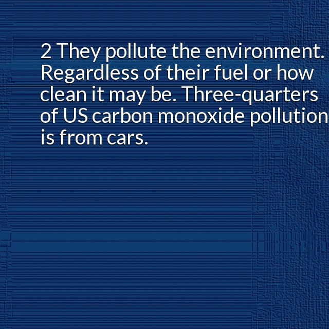 "description": "1 They contribute a large percentage of global warming. It would only get worse. It will harm us all. 2 They pollute the environment. Regardless of their fuel or how clean it may be, Three-quarters of US carbon monoxide pollution s from cars.\n",