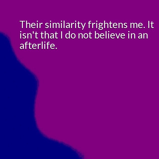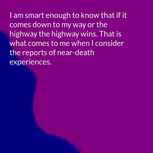 "description": "I am smart enough to know that if it comes down to my way or the highway the highway wins. That is what comes to me when I consider the reports of near-death experiences. Their similarity frightens me. It isn't that I do not believe in an afterlife.\n",