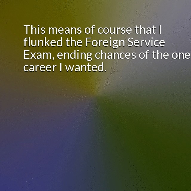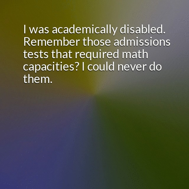 "description": "I was academically disabled. Remember those admissions tests that required math capacities? I could never do them. This means of course that I flunked the Foreign Service Exam, ending chances of the one career I wanted. \n",