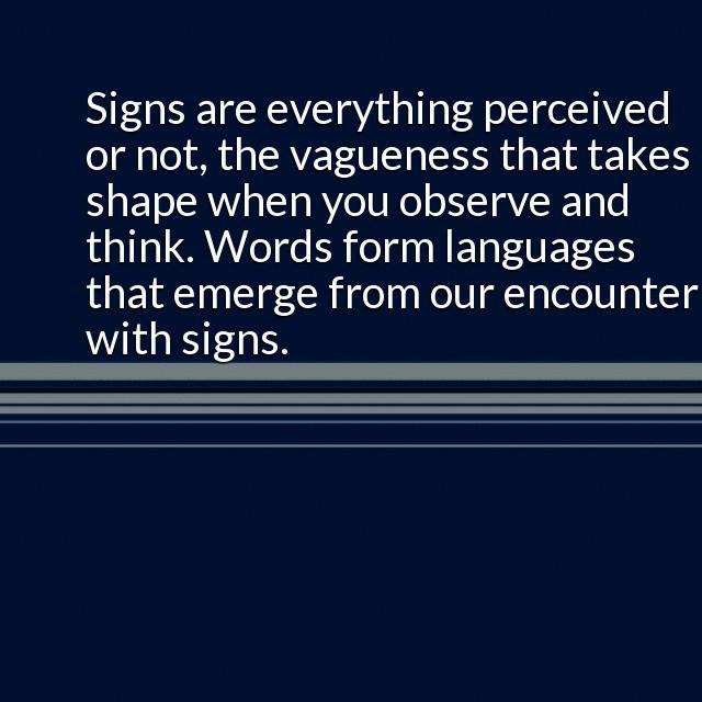 "description": "Signs are everything perceived or not, the vagueness that takes shape when you observe and think. Words from languages that emerge from our encounter with signs. The mystery is the inevitable confusion and scope of the amount that escapes us or that is yet to be revealed.\n",