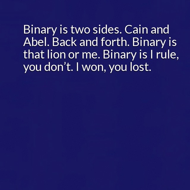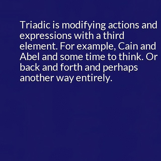 "description": "Binary is two sides. Cain and Abel. Back and forth. Binary is that lion or me. Binary is I rule, you don’t. I won, you lost. Triadic is modifying actions and expressions with a third element. For example, Cain and Abel and some time to think. Or back and forth and perhaps another way entirely.\n",