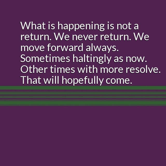 "description": "We are always moving forward What is happening is not a return. We never return. We move forward always. Sometimes haltingly as now. Other times with more resolve. That will hopefully come. \n",