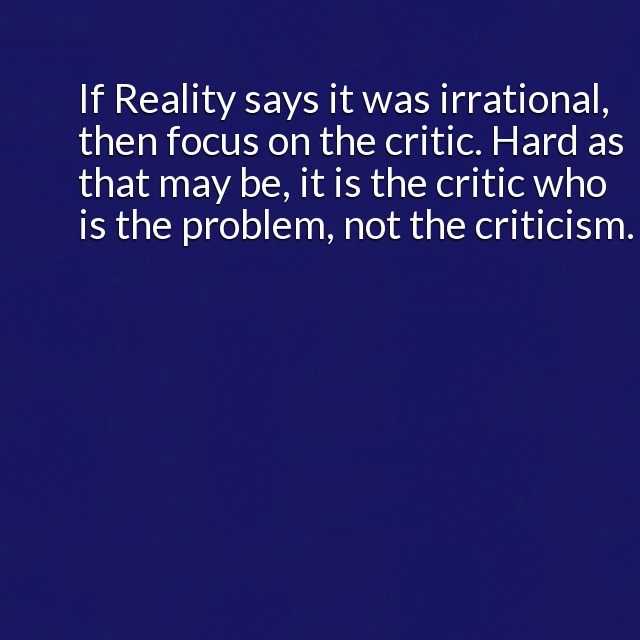 "description": "The first stop is Reality. Step back and look at the criticism. Was it rational? Do you know the cause? If Reality says it was Irrational then focus on the critic. Hard as that may be, it is the critic who is the problem, not the criticism. \n",