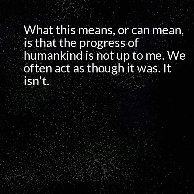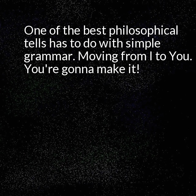 "description": "One of the best philosophical tells has to do with simple grammar. Moving from I to You. You"re gonna make it! What this means, or can mean, is that the progress of humankind is not up to me. We often act as though it was. It isn't.\n",