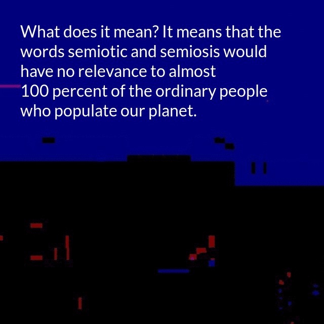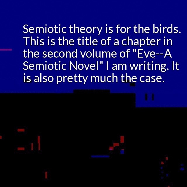 "description": "Semiotic theory is for the birds. This is the title of a chapter in the second volume of "Eve--A Semiotic Novel" I am writing. It is also pretty much the case. What does it mean? It means that the words semiotic and semiosis would have no relevance to almost 100 percent of the ordinary people who populate our planet.\n",
