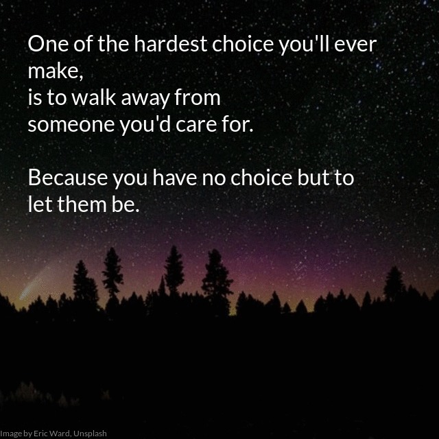 "description": "βOne of the hardest choice you'll ever make, \n\nis to walk away from someone you'd care for. \n\nBecause you have no choice but to let them be.β \n\nSource: MistyPoppie https://www.wattpad.com/myworks/227419293/write/895442128",