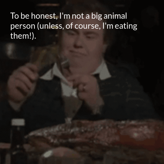 "description": "by tbanarchy To be honest, I'm not a big animal person (unless, of course, I'm eating them!).\n",